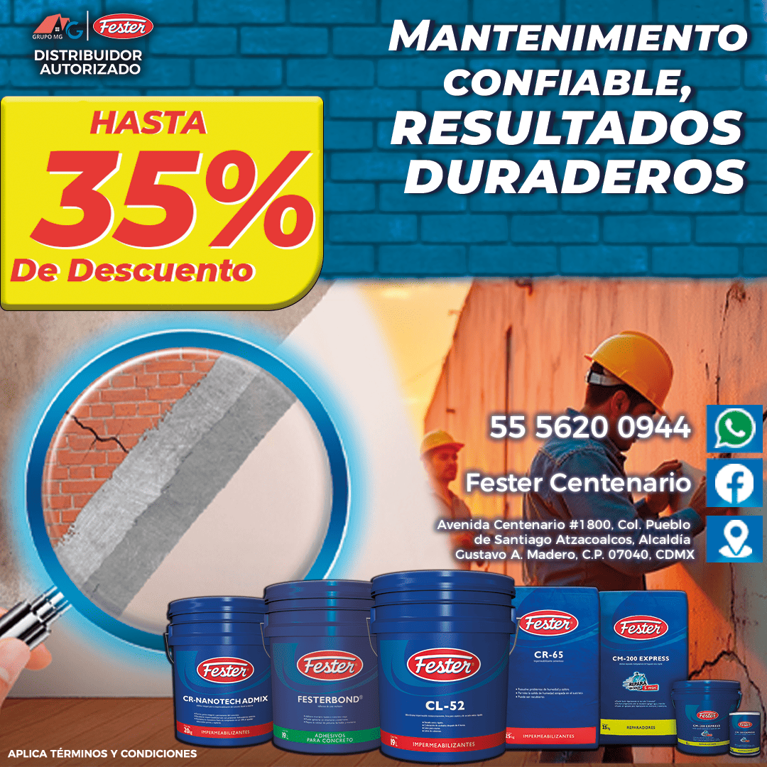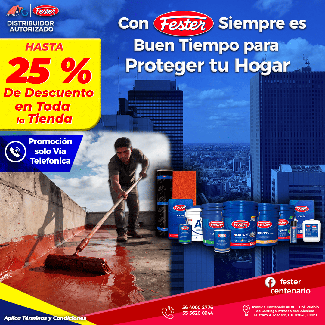 Fester es más que impermeabilizantes para techos, contamos con varias líneas que solucionan problemas de humedad y filtraciones desde la cimentación hasta el techo. Conoce todas las categorías de impermeabilizantes, da click en la imagen para ver los productos. En Fester Impermeabilizantes Centenario tenemos todos los articulos listos para enviartelos y aplicarlos por ti si tambien buscas el servicio de impermeabilización.